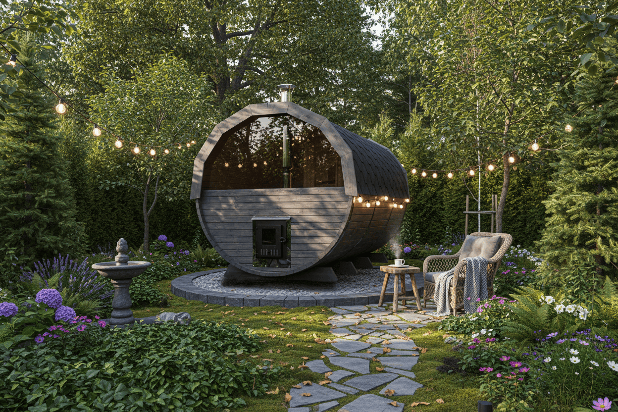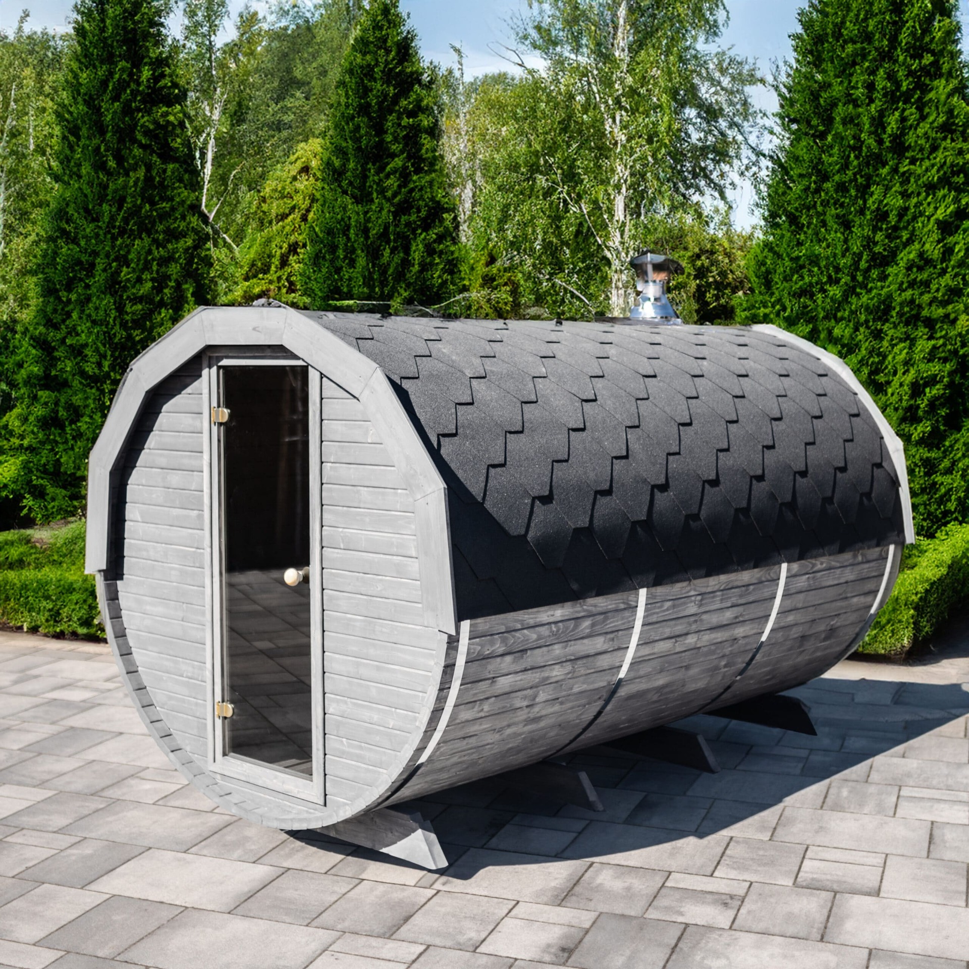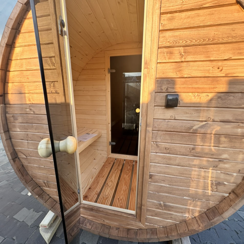 Kvalitní zahradní sudová sauna v rozměru 200 x 350 cm s předsíní o délce 100 cm pojme až 8 osob. Díky prostorné předsíňce nabízí dokonalý komfort. Vyrobena ze skandinávského smrku C24 o tloušťce 45 mm. Připravena pro instalaci elektrických kamen, nebo kamen pro zatápění dřevem. Na přání možno dovybavit proskleným panoramatickým čelem a dalšími doplňky v sekci příslušenství pro sauny.
