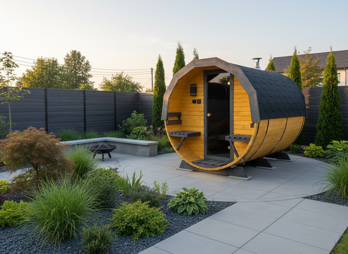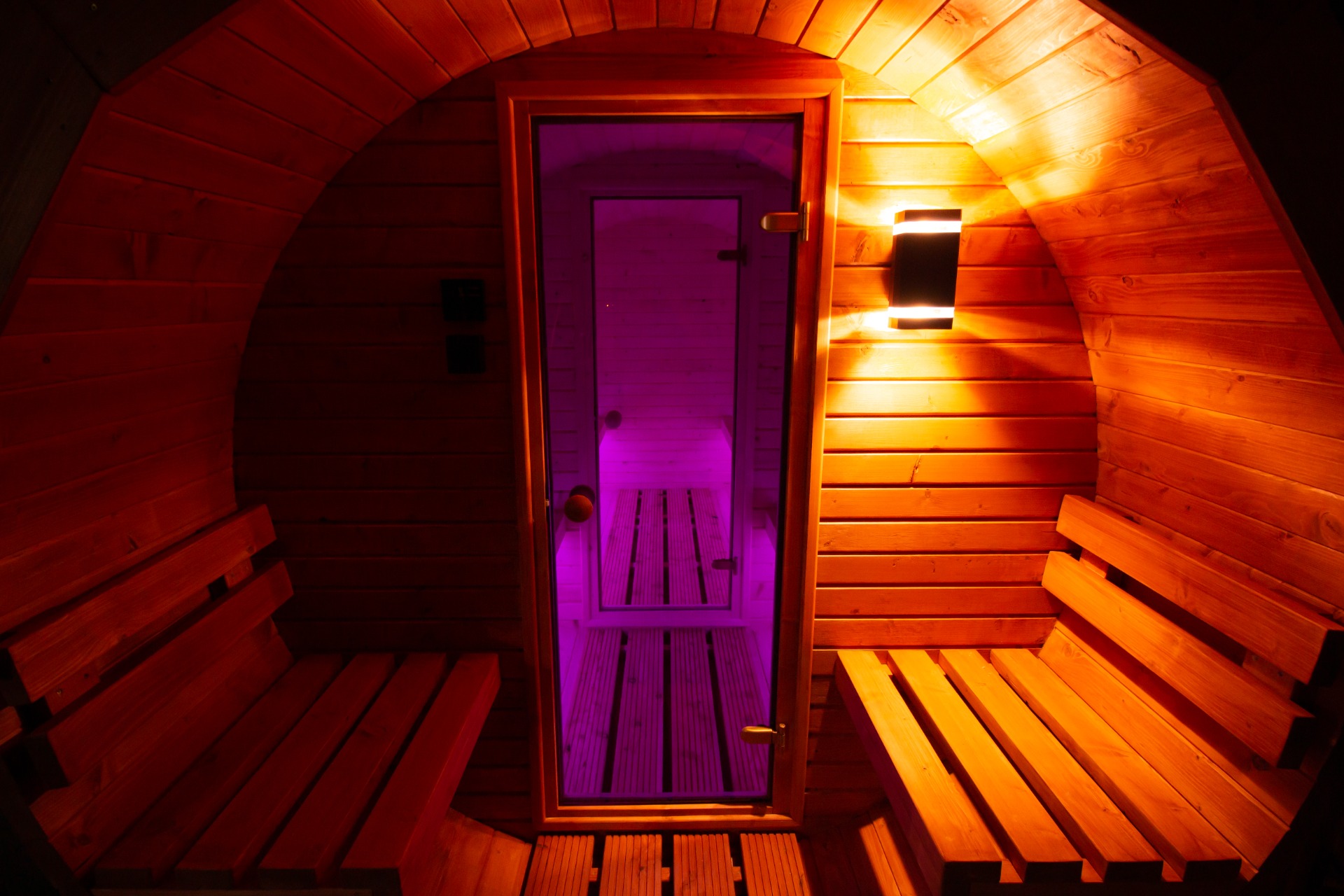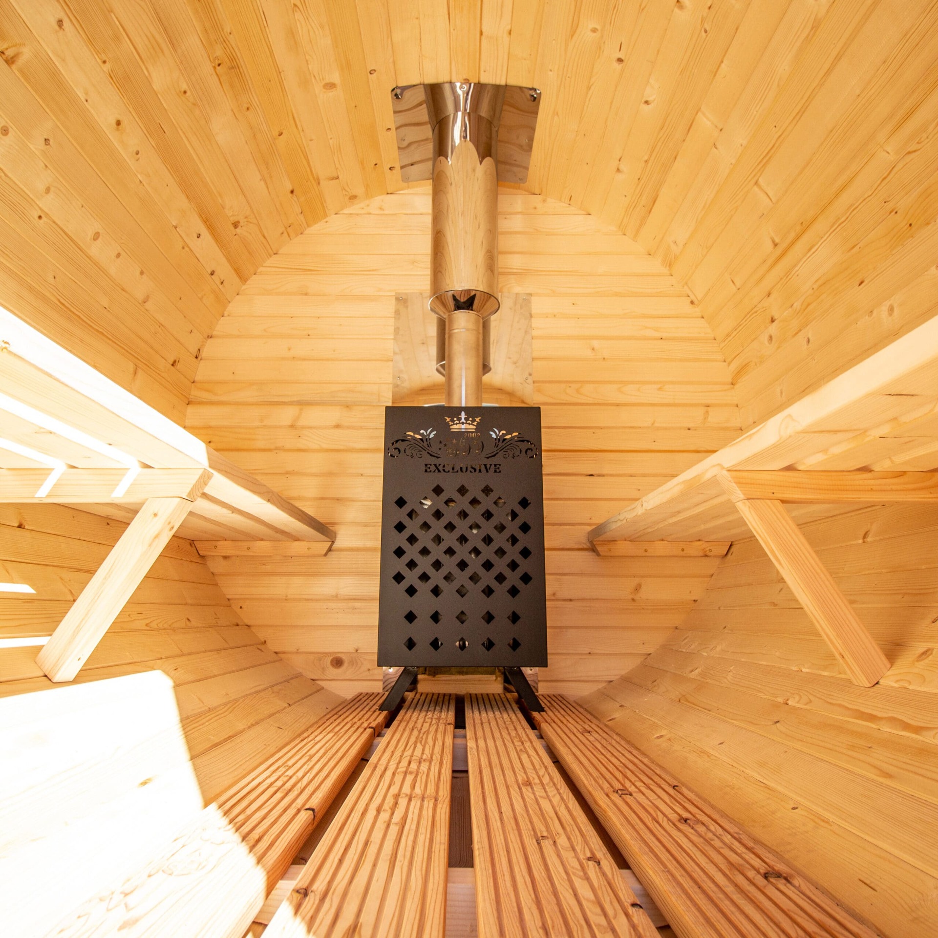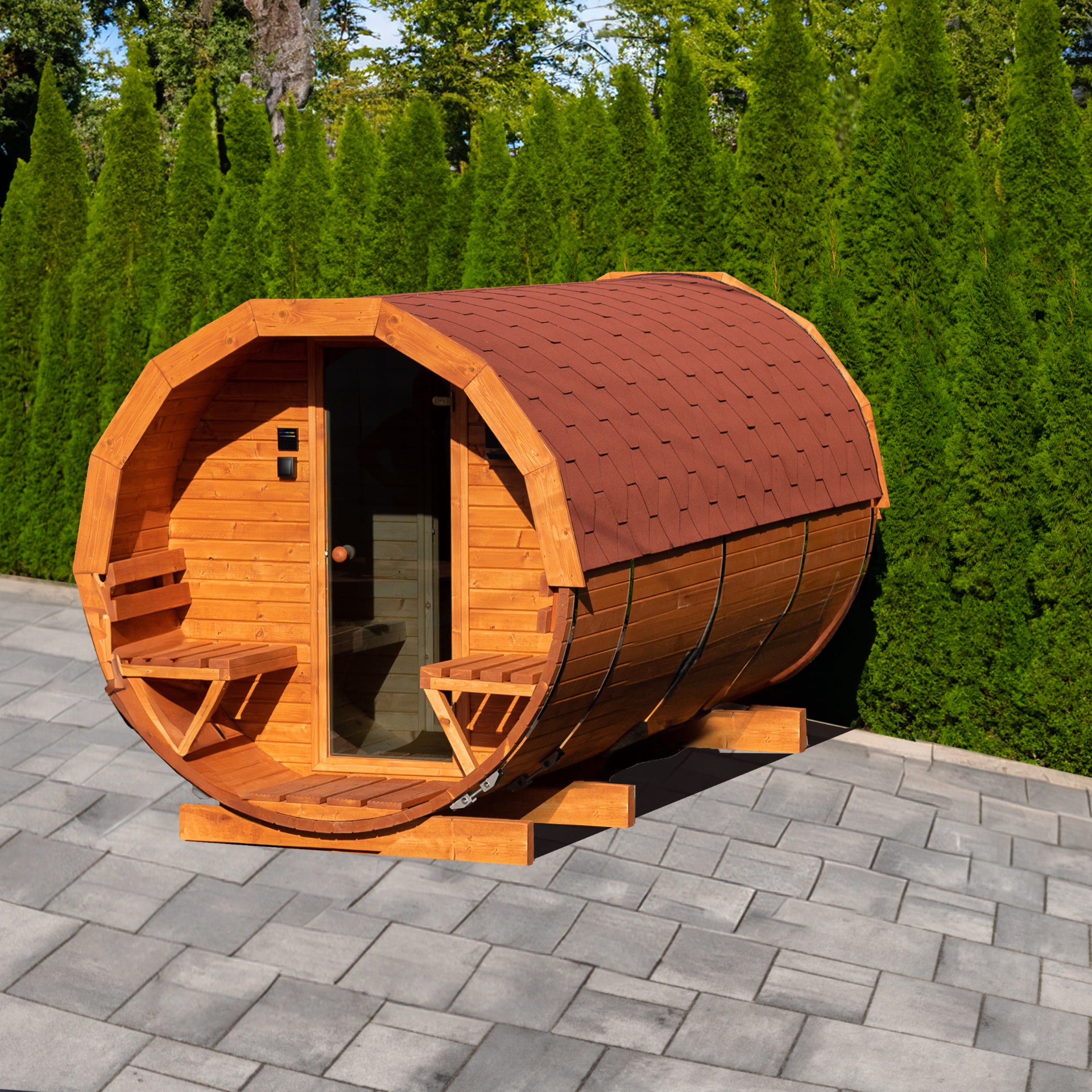 Kvalitní zahradní sudová sauna v rozměru 200 x 350 cm s venkovní verandou a předsíní o délce 100 cm vhodná pro 4-6 osob. Vyrobena ze skandinávského smrku C24 o tloušťce 45 mm. Připravena pro instalaci elektrických kamen, nebo kamen pro zatápění dřevem. Na přání možno dovybavit proskleným panoramatickým čelem a dalšími doplňky v sekci příslušenství pro sauny.