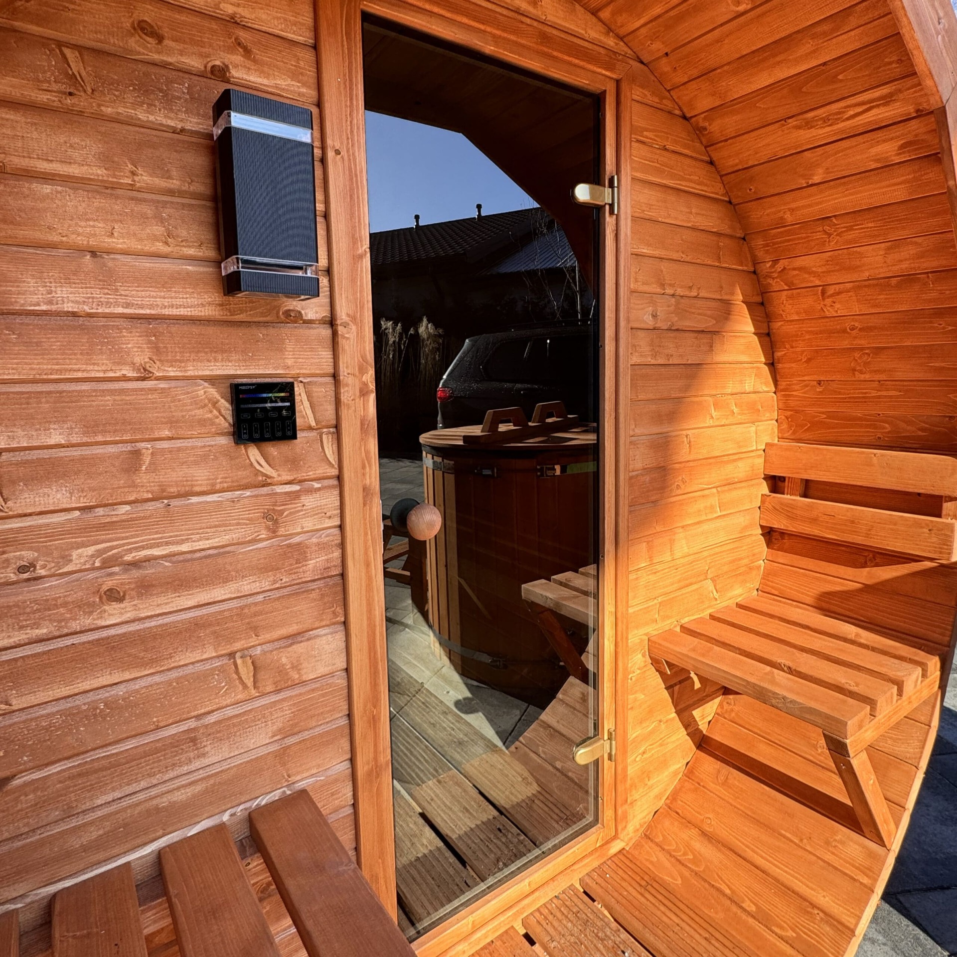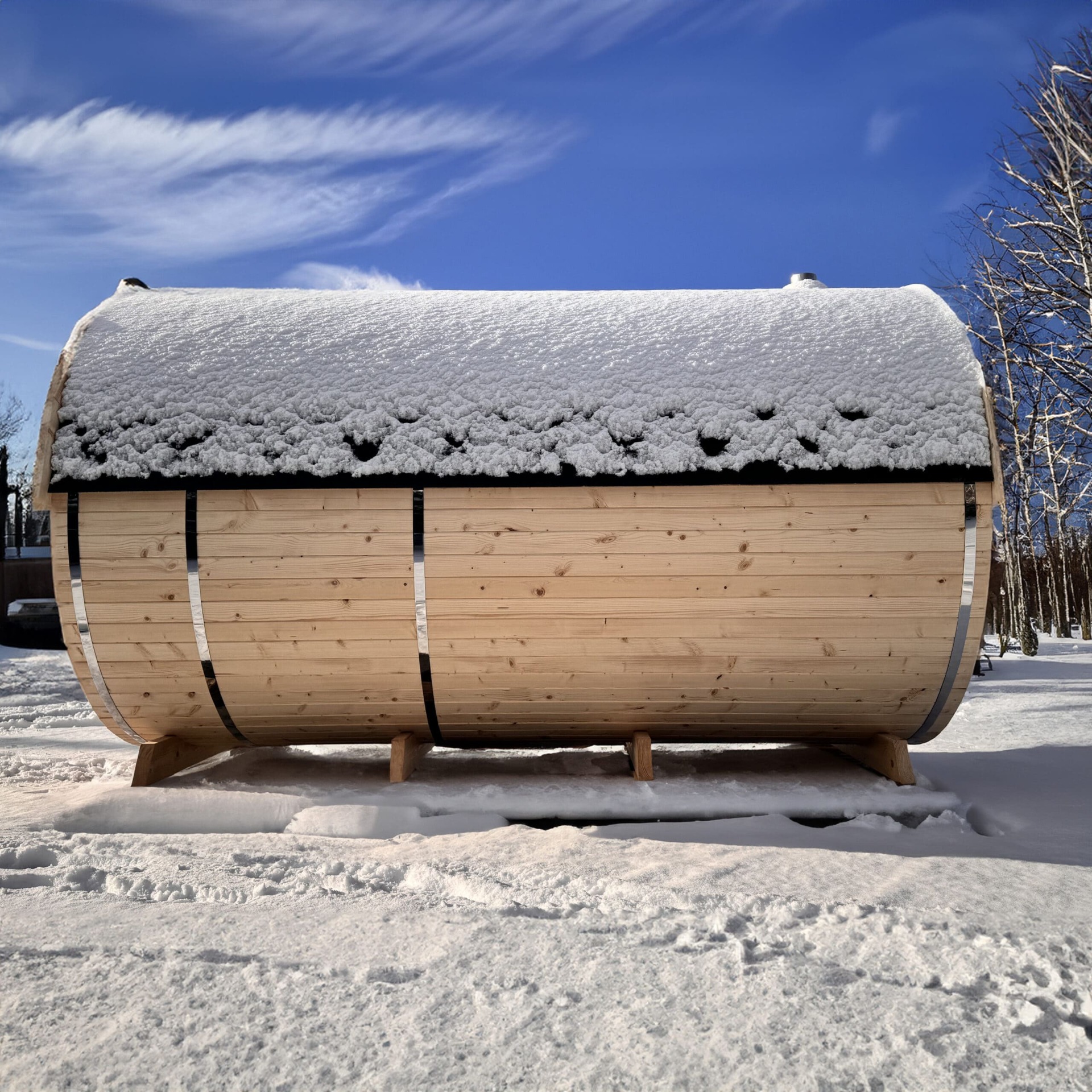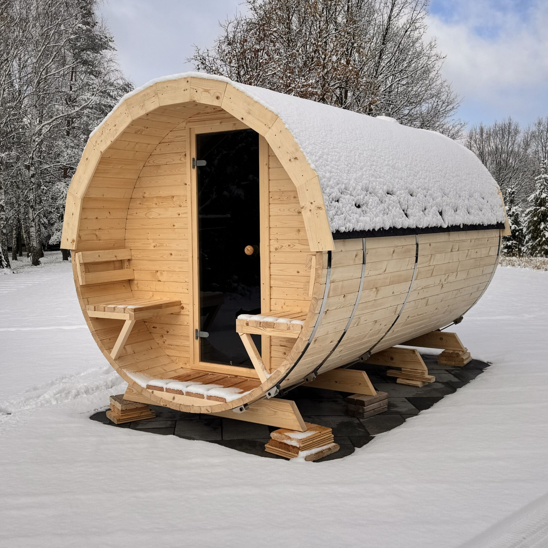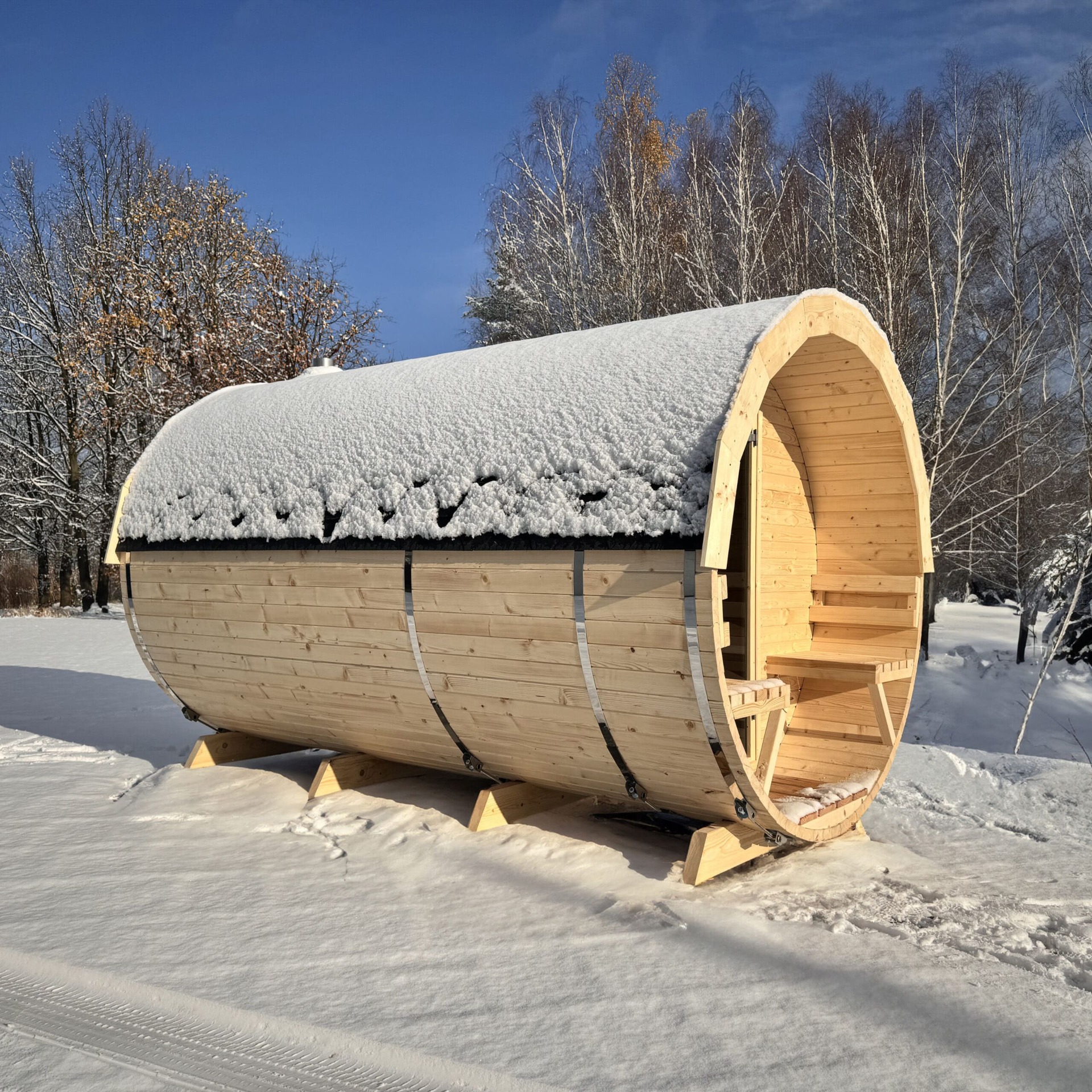 Kvalitní zahradní sudová sauna v rozměru 200 x 350 cm s venkovní verandou vhodná pro 8 osob. Vyrobena ze skandinávského smrku C24 o tloušťce 45 mm. Připravena pro instalaci elektrických kamen, nebo kamen pro zatápění dřevem. Na přání možno dovybavit proskleným panoramatickým čelem a dalšími doplňky v sekci příslušenství pro sauny.